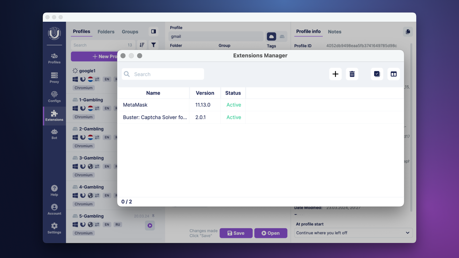 Manual configuration of each account is a waste of time. Undetectable is designed for scalability and easily handles working with more than 10,000 profiles. In a few clicks, you can create hundreds of unique accounts, and built-in managers allow you to bulk install or remove extensions across the entire farm.For convenient database transfer, import and export of IP relays (with quick validation check), cookies, User-agents, and entire sessions are provided.