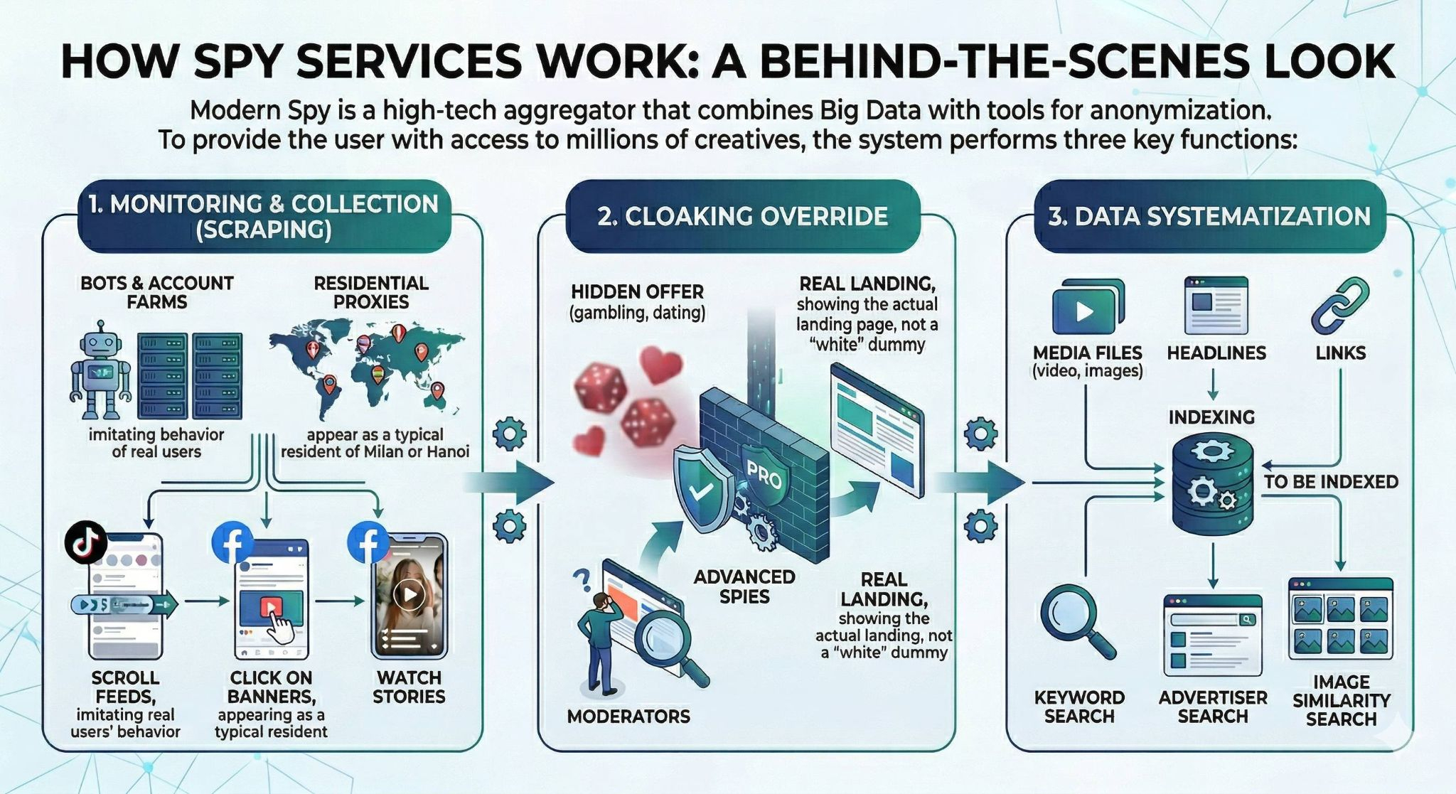 A modern Spy service is a high-tech aggregator that combines Big Data with advanced anonymization tools. To provide users with access to millions of creatives, the system performs three key functions: