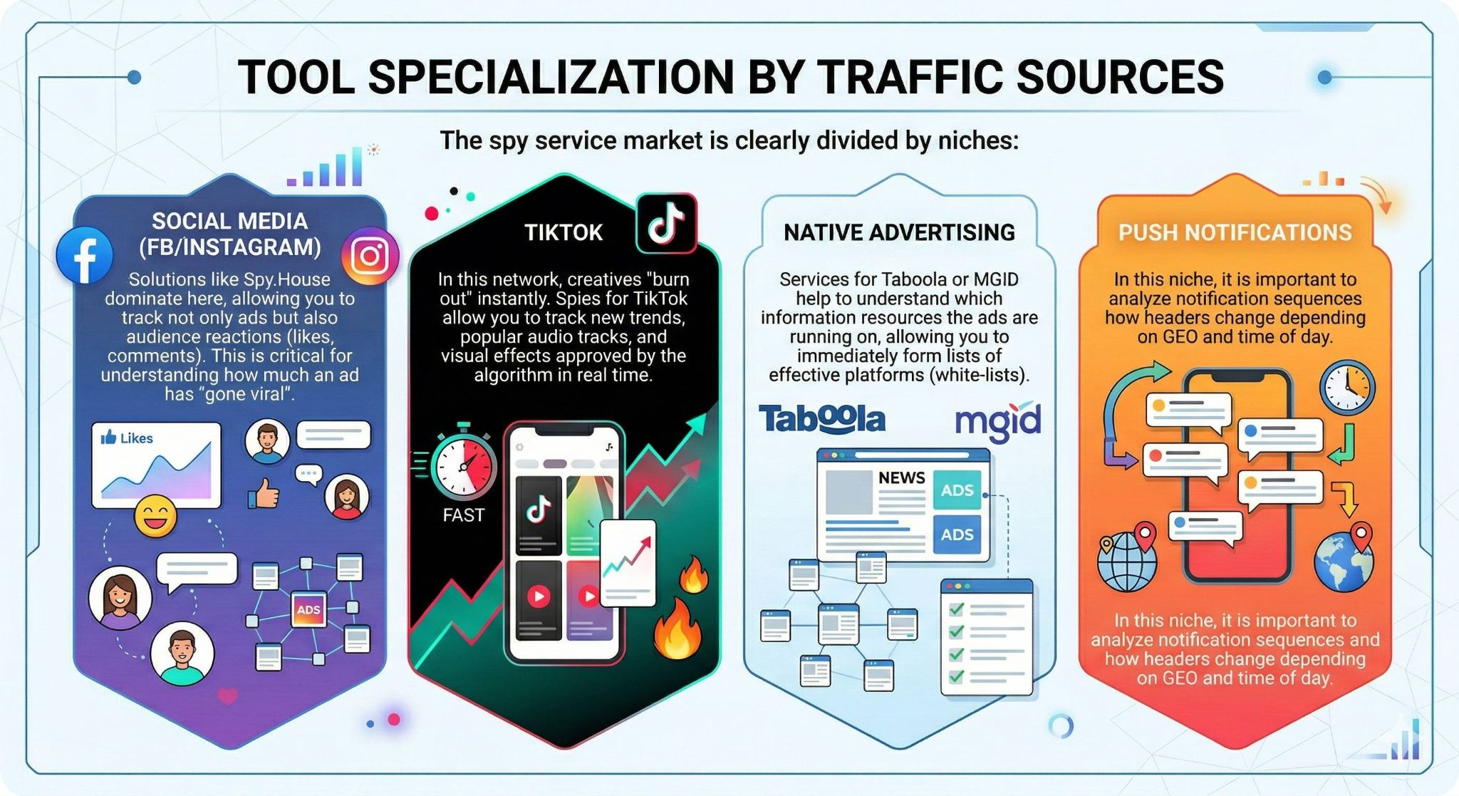 Social Media (FB/Instagram): Solutions like Spy.House dominate here, allowing you to track not just the ads, but also audience reactions (likes, shares). This is critical for understanding "virality."